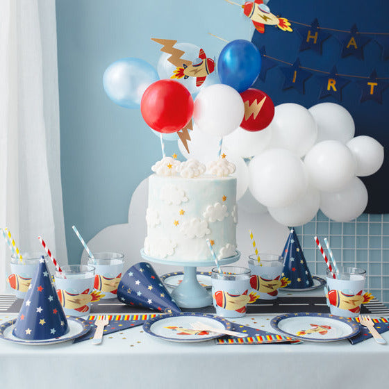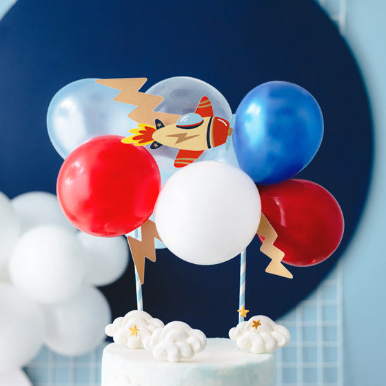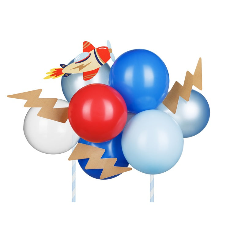 DIY διακοσμητικό τούρτας με μπαλόνια! Το σετ περιλαμβάνει 10 μπαλόνια, ένα χάρτινο αεροπλανάκι, 3 αστραπές, 2 καλαμάκια στήριξης και ταινία.